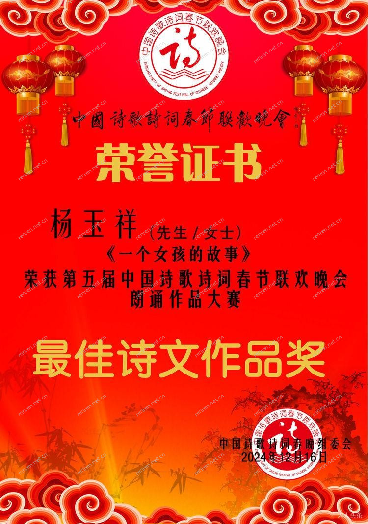 诗歌奖:金奖50名、优秀作品奖100名。电子获奖荣誉证书