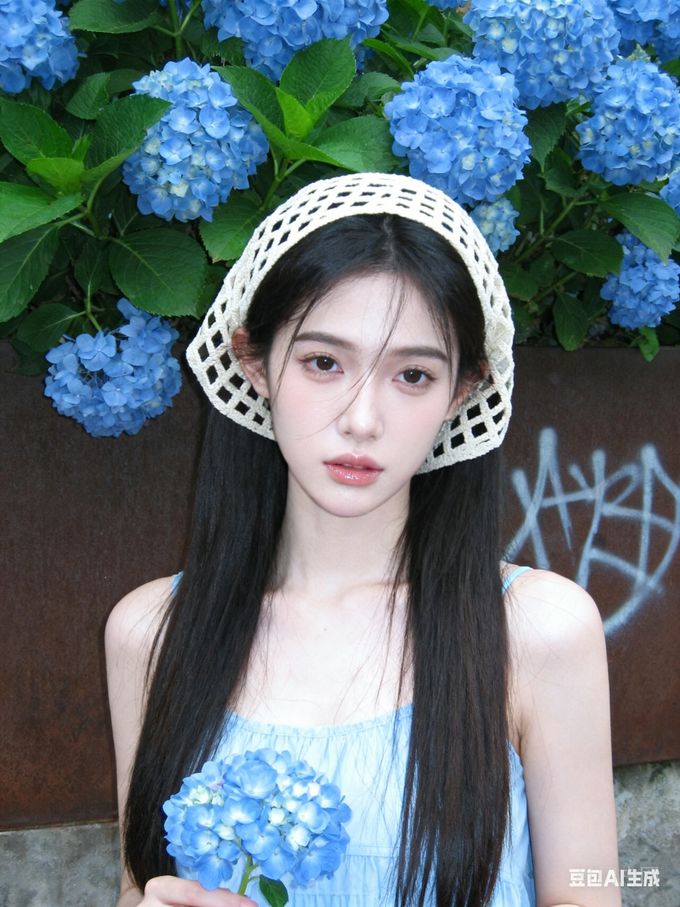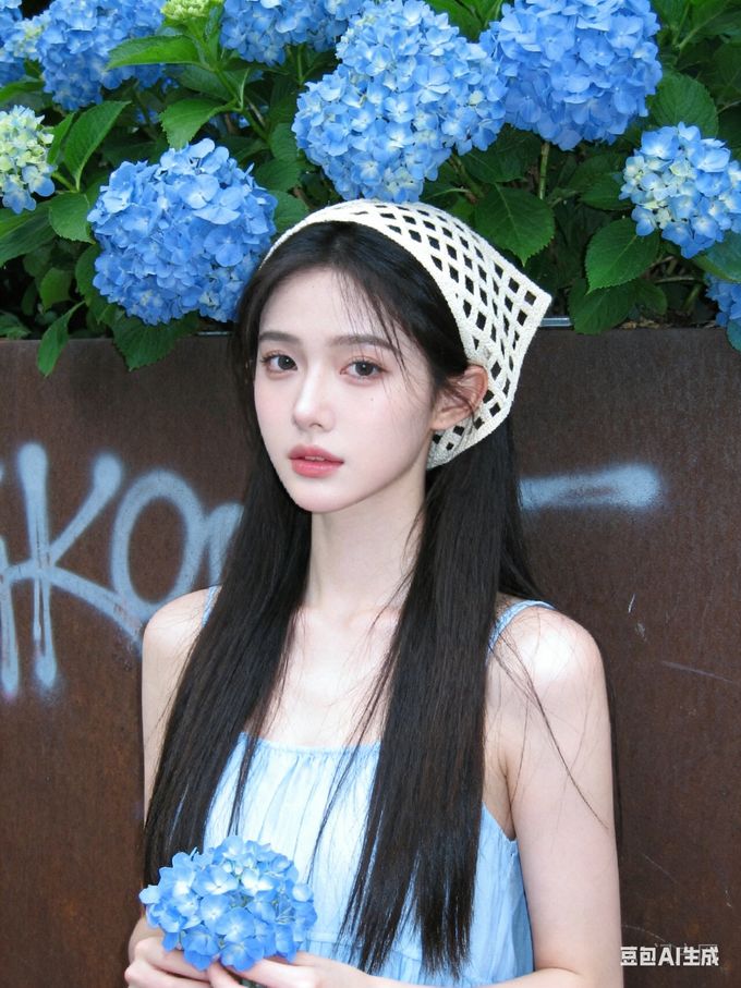 [摘要] 一组AI生成的美图:在花下面的最下方,有一位戴着米白色网格方巾,身着浅蓝色连衣裙的年轻女子,长发飘扬