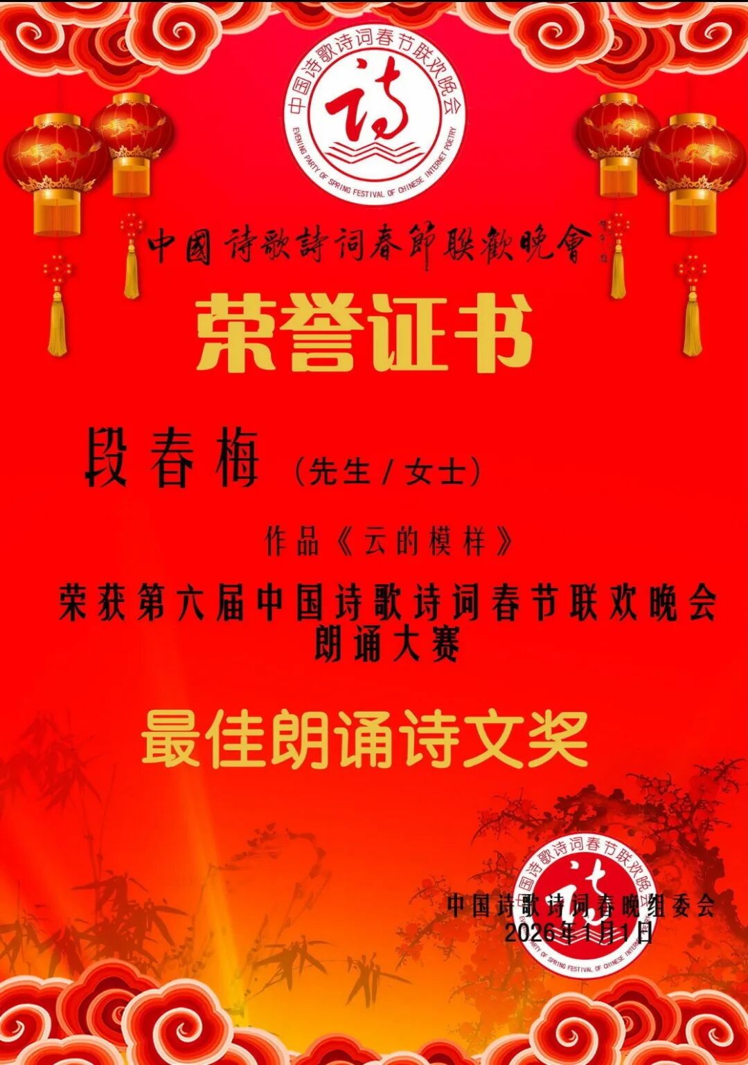 八卷诗心凝暖韵,一纸澜韵诉衷肠。衷心祝贺段春梅校友斩获文学大奖、诗集顺利出版,并荣膺第六届中国诗歌诗词春晚两项重要奖项!期待她未来创作出更多优秀作品,继续为母校争光,为华语文学事业添彩,也愿每一位校友都能在热爱的领域坚守初心、绽放光彩。