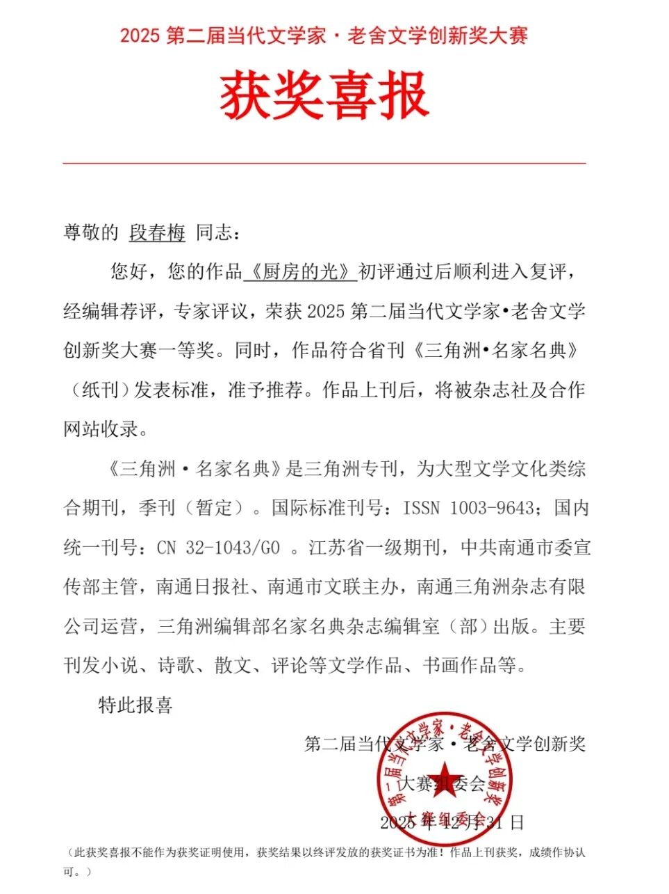 这份扎根生活、关照本心的创作,既契合大赛传承老舍先生“为人民而写”的文学精神,也彰显了“时代创新传承”的赛事主题,其获奖实至名归。据悉,该作品将被江苏省一级期刊《三角洲·名家名典》及合作网站收录,让这份烟火温情传递给更多读者。