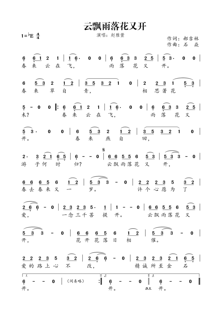 [摘要] 邓丽君唱法传承人著名青年歌手赵雅萱携新歌《云飘雨落花又开》将唱响第九届中国书画春节联欢晚会北京会场春来云在飞,雨落花又开。春来草自青,相思著花未?春来云在飞,雨落花又开。春来燕自回,游子何时归?云飘雨落花又开,春去春来又一岁。许个心愿为了爱,一念三千菩提开。云飘雨落花又开,花开花落日相催。爱的路上心