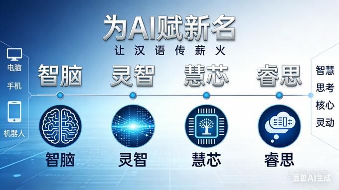 推荐以智脑、灵智、慧芯、睿思等为名,既紧扣人工智能 “智慧、思考、核心、灵动” 之本意,又兼具汉语凝练典雅、形义俱佳之美,与 “电脑、手机、机器人” 等经典汉语科技词汇一脉相承、相得益彰。以美名载大道,让智能科技与中华语言之美交相辉映,更好走进大众、服务时代、走向未来。